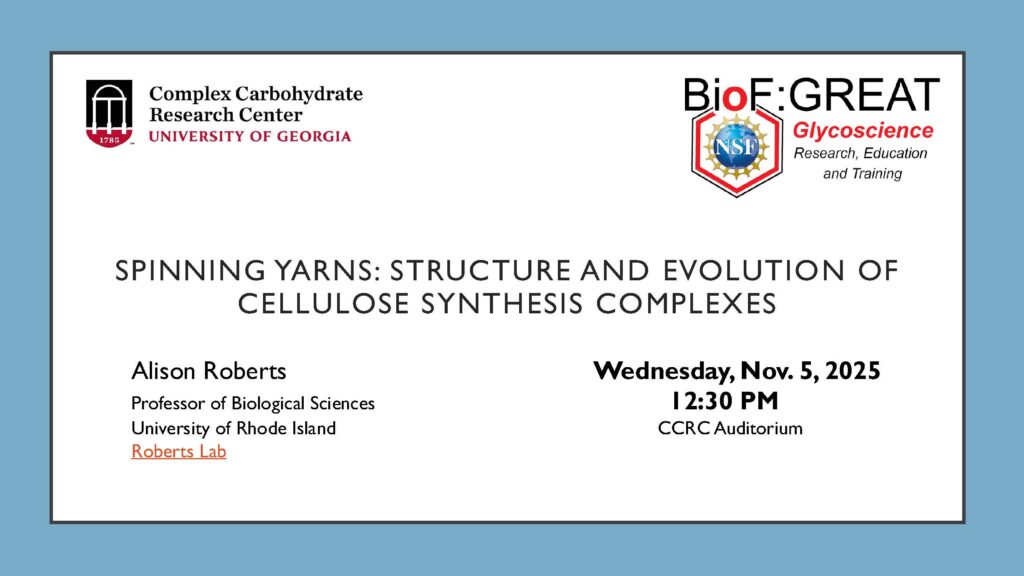 | Nov. 5 | "Spinning Yarns: Structure and Evolution of Cellulose Synthesis Complexes" | 12:30pm | Alison Roberts | CCRC Auditorium |